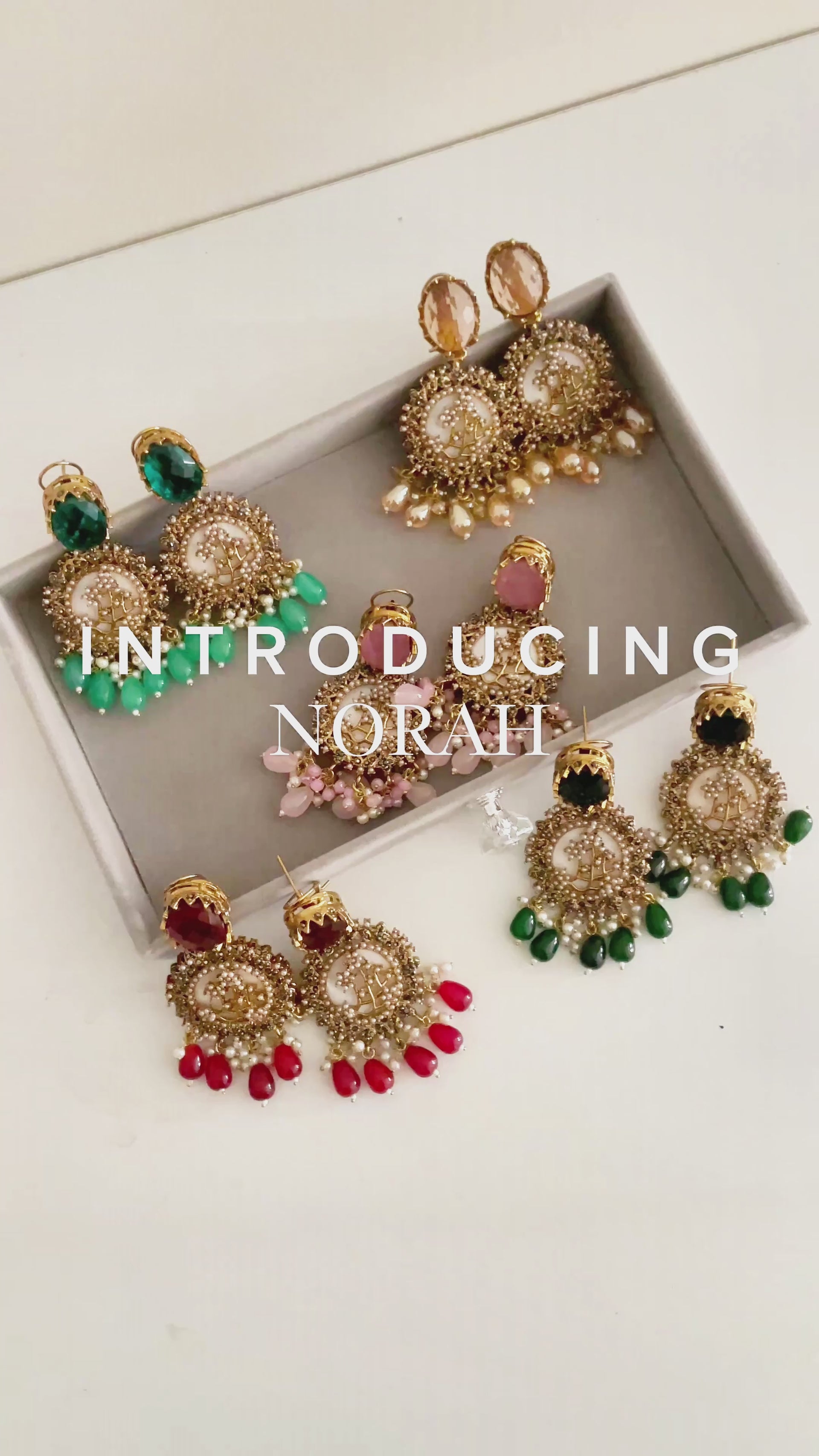 Norah, a name meaning "Light," captures the essence of a warm, intense glow framed by ethereal softness and intricate heritage detail. These earrings are a poetic statement of traditional grandeur and feminine grace, evoking the feeling of a prized jewel passed down through generations. They are designed to adorn with a captivating luminescence, where deep color meets delicate, scattered light.